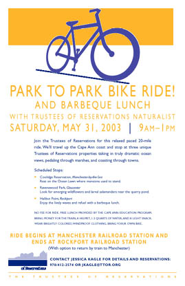 Poster for a 20-mile Park to Park Bike Ride event on Cape Ann, MA.